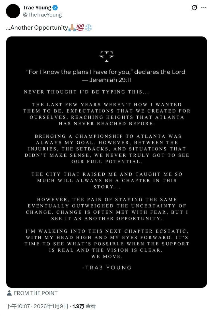 4届全明星特雷-杨被老鹰交易到奇才,换来麦科勒姆与基斯珀特。如今特雷-杨通过社媒发布长文,正式告别自己7个半赛季的老鹰生涯,也是告别亚特兰大的岁月,而他遗憾未能帮助亚特兰大这座城市带来一座NBA总冠军。